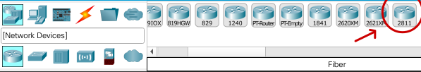 Vá em Network Devices, e abaixo escolha Routers. Vão aparecer várias opções ao lado. Escolha o último roteador, o 2811. Arraste este roteador duas vezes para a área branca.