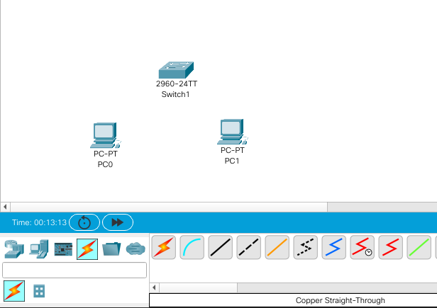 Após isso, vá em Connections, indicado por um raio laranja. Há vários tipos de cabos disponíveis abaixo. Vamos utilizar o Copper Straight-Through, o cabo representado por uma linha contínua de cor preta . Clique nele e você verá que o cursor do mouse irá mudar para um fio preto; agora, clique em um dos PCs. O que deve aparecer é o seguinte: